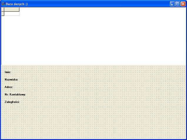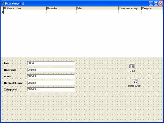 21) Kliknij na komponent DBEdit z prawej strony od „Imie:” i w Inspektorze Obiektów ustaw właściwość DataField na Imie. Ustaw „Nazwisko” na Nazwisko. Ustaw „Adres” na Adres”. Ustaw „Nr Kontaktowy:” na Numer Kontaktowy a „Zaległości” na Zaleglosci.