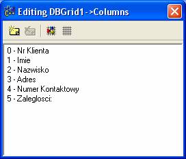 19) Trochę niezbyt przejrzyście może wyglądać tabelka na górze. Kolumny mogą być za długie. Kliknij raz na tabelce i w Inspektorze Obiektów kliknij dwa razy na Columns. Uruchomi się coś w rodzaju „Editing DBGrid1->Columns”. Kliknij przycisk Add All Fields aby wypełnić je polami z pliku bazy danych.