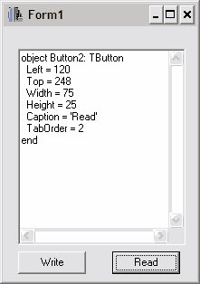 pms->ReadComponent(c); delete pms; delete pss; } //--------------------------------------------------------------------------- void __fastcall TForm1::Button2Click(TObject *Sender) { StringToComponent(Button2, Memo1->Text); }